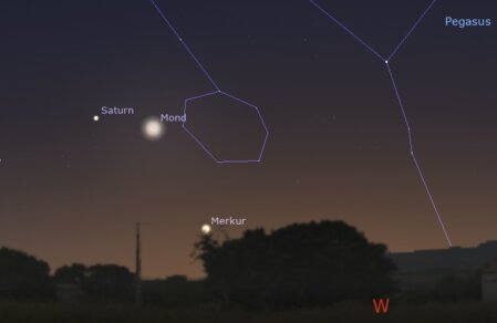 Im Februar bietet sich die Chance für eine Abendsichtbarkeit des Merkur. Am 19. Februar (siehe Abbildung) befindet er sich in seiner größten östlichen Elongation. Um 18:30 Uhr lässt er sich knapp über dem Westhorizont beobachten. Dafür benötigt man allerdings eine gute Horizontsicht. Als Aufsuchhilfe kann der Mond dienen, der sich in nächster Nähe befindet. Auch den Saturn kann man dort sehen.