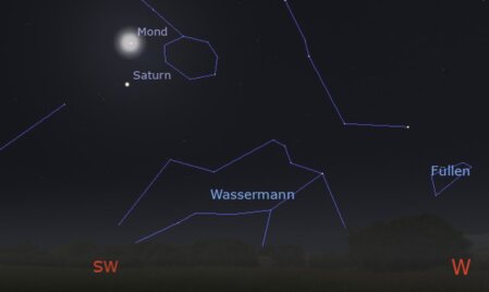 Die nebenstehende Abbildung zeigt ebenfalls unseren Erdtrabanten, allerdings in der Nachbarschaft des Saturns. Diesen Himmelsanblick kann man am Abend des 23. Januar gegen 19 Uhr genießen.
