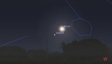 Im Oktober bietet sich wieder einmal die Beobachtung von Planeten an. Da die Nächte jetzt allmählich wieder länger werden, werden auch die Beobachtungsbedingungen besser. Bei zwei Planeten kann uns der Mond als Aufsuchhilfe dienen. Am 6. Oktober befindet sich der Mond in der Nähe des Saturns im Sternbild Fische (siehe nebenstehende Abbildung). Allerdings muss man dazu zeitig aufstehen. Die Abbildung zeigt die Situation am Westhimmel gegen 5 Uhr. Am Morgen des 19. Oktober stattet der Mond dann der Venus einen Besuch ab. Auch dies ist sicher ein lohnenswerter Himmelsanblick.